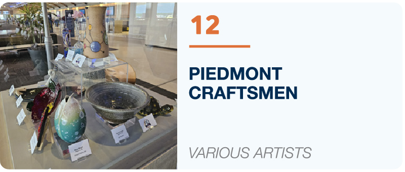 The Piedmont Triad International Airport is proud to present our Walking Tour of Art. Celebrating local artists from all over the Triad and surrounding areas, the art displayed on the arrivals and departures levels and outside the airport has been selected based on variety, creativity and expression. The collection on display rotates annually. Visit us often and enjoy the arts at PTI.